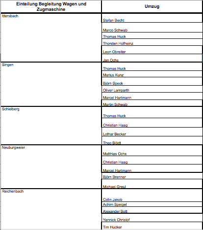 Hier sind unsere finalen Einteilungspläne für die Dienste am und auf dem Faschingswagen.